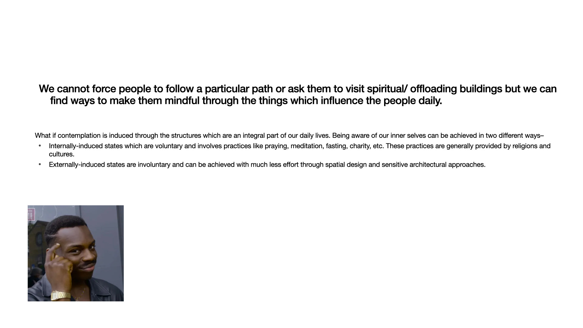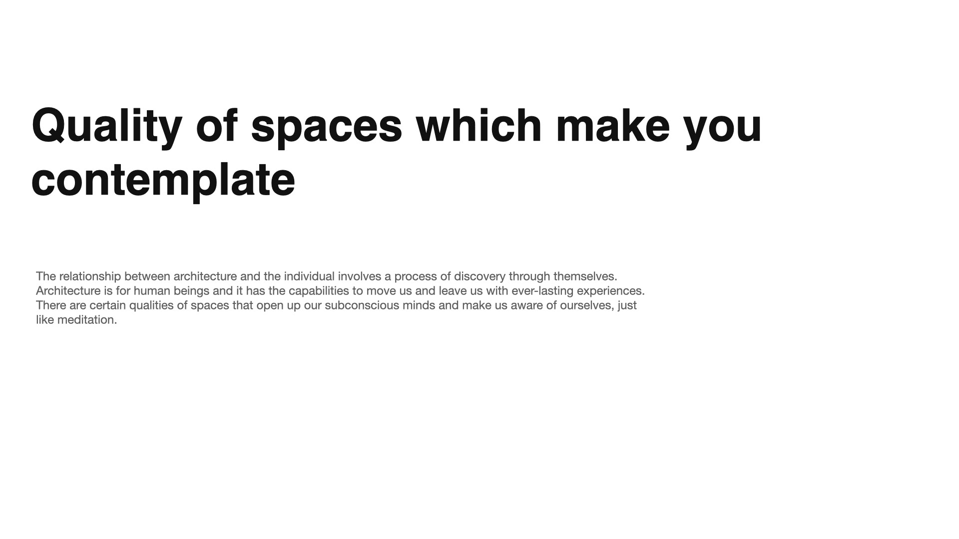 Mindful architecture is a concept project, addressing the concept of mindfulness and connecting it to architecture. Mindfulness is a concept rooted in ancient contemplative practices, particularly within Buddhist traditions, and it has gained significant attention in modern psychology and wellness.The relationship between architecture and the individual involves a process of discovery through themselves. Architecture is for human beings and it has the capabilities to move us and leave us with ever-lasting experiences. There are certain qualities of spaces that open up our subconscious minds and make us aware of ourselves, just like meditation.